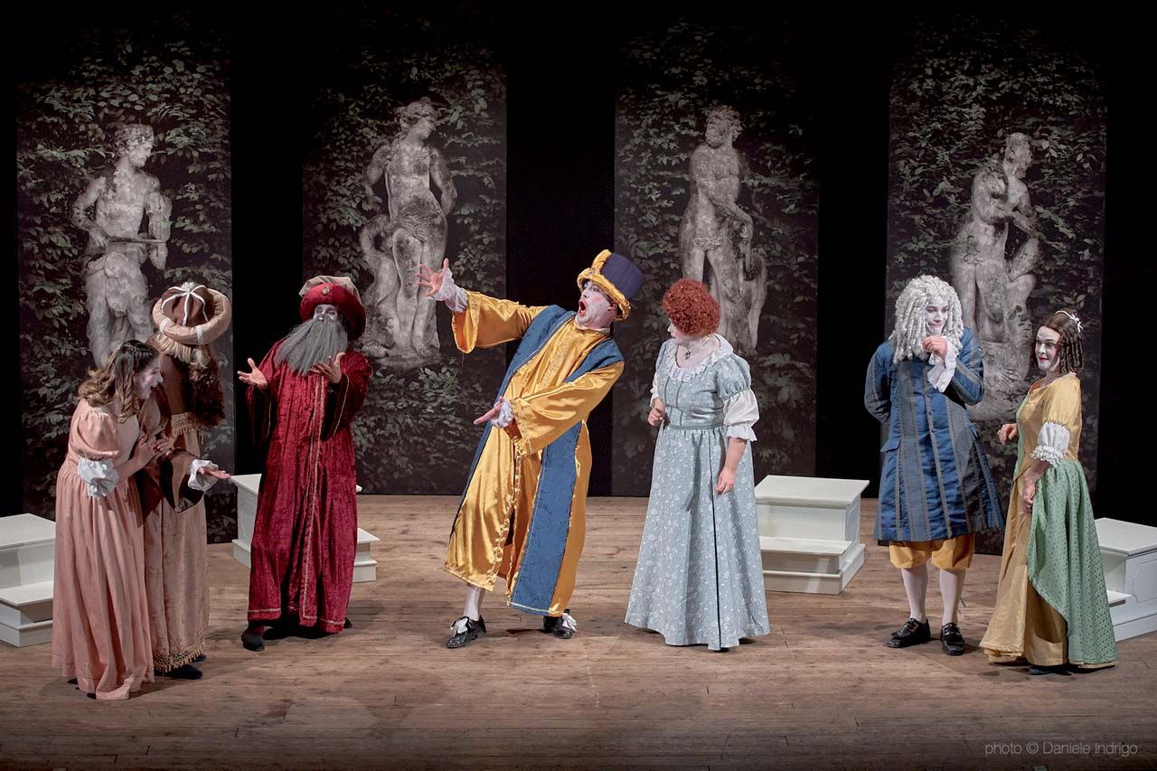 Monsieur Jourdain ha un chiodo fisso: diventare un gentiluomo. Se non per nascita, essendo egli un facoltoso mercante, almeno per educazione e buone maniere. Per far questo si circonda di precettori dalle competenze piuttosto dubbie, veste in modo fin troppo sfarzoso, impegna i denari in prestiti ad amici – questi sì nobili, ma sempre a corto di contante – e in feste e regali per ben comparire in società. Nonostante le ripetute rimostranze della moglie, Madame Jourdain, e i battibecchi con la serva Nicoletta, sembra infatti che nulla lo possa distogliere dalle affettate lusinghe del conte Dorante e dall’infatuazione per la marchesa Dorimene. E poi, sopra ogni altra cosa, incrollabile è la sua speranza di maritare almeno la figlia Lucilla con un nobile rampollo. Il fatto è che la fanciulla ama invece Cleonte – borghese anche lui – il cui fido “compare” è Coviello, furbo e maneggione, a sua volta innamorato di Nicoletta. Quando la situazione s’ingarbuglia al punto da sembrare senza via d’uscita, giunge inattesa una proposta di matrimonio dal Figlio del Gran Turco, con conseguente investitura nobiliare del futuro suocero… Sarà tutto vero?